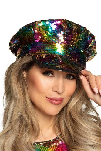 Deze Kapiteinspet Regenboog heeft omkeerbare pailletten in de regenboogkleuren en goud.Â