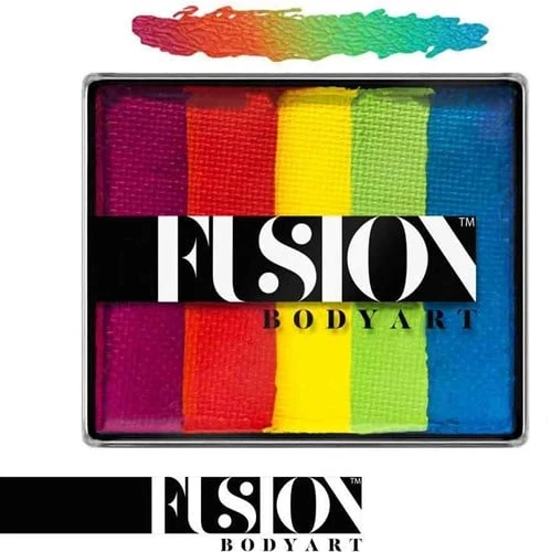 Fusion Body Art Rainbow Cake Schmink is snel en gemakkelijk aan te brengen met een vochtige penseel of spons. Fusion Rainbow Cake schmink kan eenvoudig worden verwijderd met water en zeep of met de schminkwashand. Omdat Fusion Body Art schmink veel pigment bevat adviseren wij om Marly Skin huidbeschermingsschuim aan te brengen voordat je gaat schminken. Fusion Body Art schmink bevat alleen hoogwaardige FDA- en EU-conforme huidveilige pigmenten en ingrediënten die zacht zijn voor de huid. Elke kleur is zorgvuldig ontwikkeld om u de helderste en meest dekkende kleuren te geven voor jouw schminkontwerpen. Fusion Body Art schmink droogt snel en heeft na droging een veegvaste finish. Je kunt kleuren over elkaar heen leggen zodra de basiskleur droog is, en je kunt Fusion Body Art schmink mengen terwijl ze nog nat zijn om eindeloos mooie tinten te maken.