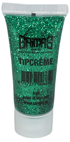 Grimas Tipcrème 041 is een glittergel in de kleur groen. Tipcrème is een helder glanzende polyethyleen glitter in een sneldrogende en gemakkelijk afwasbare geltextuur. Het wordt gebruikt voor onder andere gezichtsbeschildering. Anders dan de naam crème doet vermoeden, bevat de gel geen oliën en wassen. Tipcrème zit in een tube van 8 ml.