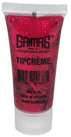 Grimas Tipcrème 051 is een glittergel in de kleur rood. Tipcrème is een helder glanzende polyethyleen glitter in een sneldrogende en gemakkelijk afwasbare geltextuur. Het wordt gebruikt voor onder andere gezichtsbeschildering. Anders dan de naam crème doet vermoeden, bevat de gel geen oliën en wassen. Tipcrème zit in een tube van 8 ml.