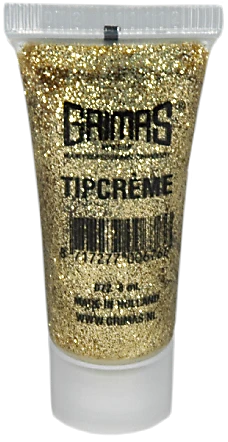 Grimas Tipcrème 072 is een glittergel in de kleur goud. Tipcrème is een helder glanzende polyethyleen glitter in een sneldrogende en gemakkelijk afwasbare geltextuur. Het wordt gebruikt voor onder andere gezichtsbeschildering. Anders dan de naam crème doet vermoeden, bevat de gel geen oliën en wassen. Tipcrème zit in een tube van 8 ml.