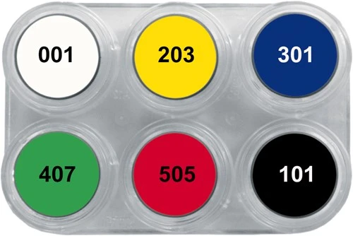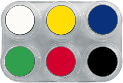 Dit 6 kleuren water make-up palet van Grimas bevat de kleuren 001 Wit, 203 Geel, 301 Blauw, 407 Felgroen, 505 Dieprood en 101 Zwart. Grimas Water Make-up (Pure) is een ongeparfumeerde en glutenvrije schmink, bedoeld voor gezichts- en lichaamsbeschildering. Deze schmink van Grimas werkt net als waterverf. De kleuren zijn onderling mengbaar. Pure betekent dat het betreffende product geen chemische conserveermiddelen (zoals bijvoorbeeld parabenen) of halogeen organische verbindingen bevat. Deze schmink van Grimas mag rondom de ogen en op de slijmvliezen worden gebruikt.