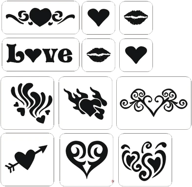 Met deze in de hartjes glittertattoo sjablonen maakt u heel eenvoudig een leuke glittertatoeage in het thema liefde.