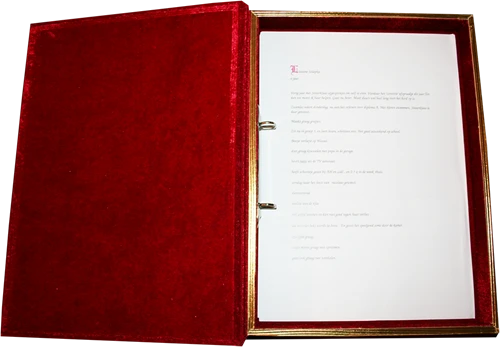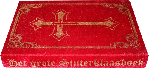 Een mooi boek van Sinterklaas uitgevoerd in velour rode stof met gouden bedrukking en gouden afwerking. Twee perforatie gaatjes in de verlanglijsjes en Sinterklaas kan op pad! Het grote boek van Sinterklaas heeft de afmetingen 25 x 33 x 4 cm.