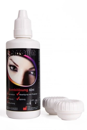 Alles in één contactlenzen vloeistof voor zachte contactlenzen en een lenzen bewaardoosje.