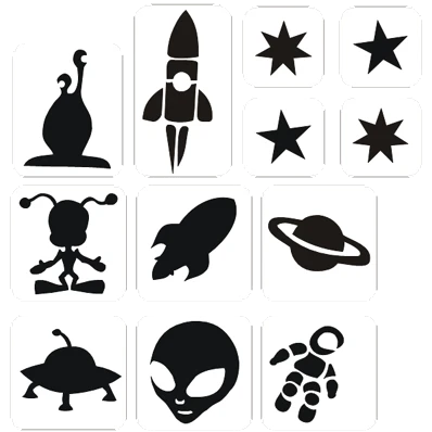 Met deze in de ruimte glittertattoo sjablonen maakt u heel eenvoudig een leuke glittertatoeage in het ruimte thema.