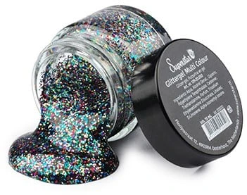 De Superstar Glittergel bevat polyester glitter (3 hex) van cosmetische kwaliteit in een gel basis. De gel is zo ontwikkeld dat je deze ook aan kan brengen op schmink zonder dat het deze oplost. Bovendien droogt de gel snel op. Voor een super glinsterend effect kan je een extra laag losse glitters aanbrengen wanneer de gel nog nat is. Â